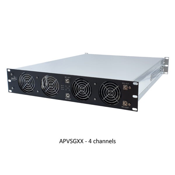 APVSGXX-X là nguồn tín hiệu điều chế vectơ chuyển mạch nhanh siêu linh hoạt đa đầu ra, bao phủ dải tần số liên tục với các kiểu từ 10 MHz đến 4, 6, 12, 20 hoặc 40 GHz. APVSGXX-X với 2, 3 hoặc 4 kênh được gắn trong vỏ 19 ‘‘ 2HU (86 H x 426 W x 480 mm L [3,4 H x 16,8 W x 18,9 in L], 18 kg). Mỗi đầu ra có thể được lập trình độc lập về tần số, công suất, pha và điều chế. Các đầu ra kết hợp theo pha với độ ổn định pha tuyệt vời.