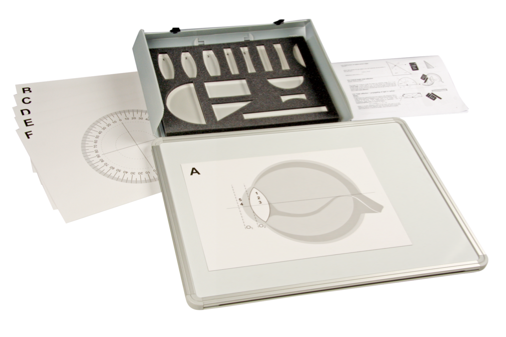 Với bộ dụng cụ này, các thí nghiệm biểu diễn hiện tượng quang học được chứng minh.