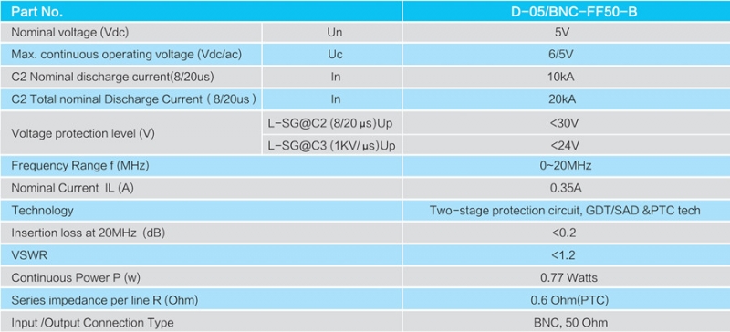 Prosurge D-05 / BNC SPD được thiết kế cho các hệ thống đồng trục như camera và hệ thống bảo vệ chống lại những thiệt hại do sét và gai gây ra bởi sét và các nguồn điện khác. Chúng thích hợp cho các loại B, C (ANSI / IEEE C62.41) hoặc trực tiếp ở thượng nguồn gần các thiết bị được bảo vệ.