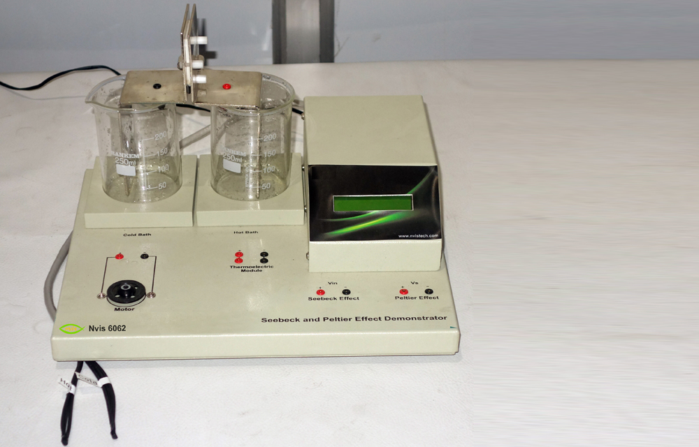 Seebeck and Peltier Effect Demonstrator, Nvis 6062 illustrates the two thermoelectric effects. It is useful in understanding the conversion of thermal energy into electrical energy and vice versa. The thermoelectric module used is of high quality and has advantage over conventional thermocouple in term of its Seebeck and Peltier Coefficients. Thermal emf is generated by heating one arm and cooling the other arm of the thermoelectric module.