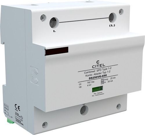 DS250VG-690 và DS253VG-690 là sản phẩm đặc biệt được thiết kế bảo vệ cho hệ thống điện xoay chiều từ các Turbine (tua bin) điện gió của hệ thống điện năng lượng gió (phong điện) với mức điện áp 400/690 Vac DS250VG-690 : Bảo vệ cho 1 dây nguồn điện 400 Vac (L-N) DS253VG-690 (gồm 3 DS250VG-690): bảo vệ cho 3 dây nguồn AC 400/690 Vac. Sản phẩm thuộc dòng thiết bị cắt sét sơ cấp Type 1 và cả type 2+3 với công nghệ VG ưu việt của tập đoàn CITEL Pháp, chúng có khẳ năng cắt các xung sét lan truyền đến 100kA/pha (8/20us) và xung sét trực tiếp đến 25kA/pha (10/350us). DS250VG-690 và DS253VG-690 được lắp đặt tại tủ điện tổng của hệ thống điện gió trước khi vào máy biến áp hòa lưới với mạng điện, có cấu tạo kiểu gắn trên din-ray của tủ điện nên dễ dàng phối hợp với các thiết bị khác. Tình trạng hoạt động của thiết bị chống sét DS250VG-690 và DS253VG-690 được nhận biết qua chỉ thị màu trên mặt sản phẩm (khi hiển thị màu đỏ nghĩa là đã hư hỏng) hoặc thông qua tiếp điểm kết nối báo hiệu ra bên ngoài bằng âm thanh / đèn hiệu. Sản phẩm đã được kiểm tra và thử nghiệm đáp ứng các tiêu chuẩn IEC 61643-11 / EN 61643-11 / UL1449 ed.4 |