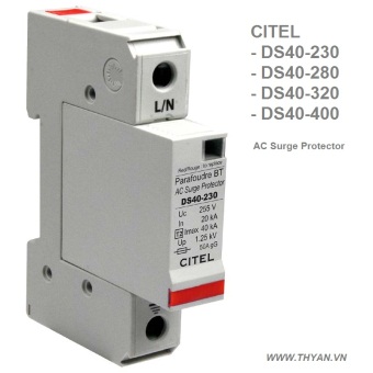 Cắt sét type 2, bảo vệ thứ cấp. Khả năng chịu dòng sét : 40kA Module kiểu cắm rút gắn trên din-ray Tích hợp tiếp điểm báo hiệu từ xa Phù hợp tiêu chuẩn IEC 61643-1 và EN 61643-11 CITEL DS40 (hay còn gọi là DS41) là thiết bị cắt sét lan truyền nguồn điện AC type 2 dạng module gắn trên ray, bảo vệ thứ cấp cho mạng điện 1 và 3 pha tại các tủ điện nhánh khi kết hợp chúng lại với nhau. Các phiên bản của DS40 DS41-230 (gồm 1 modul DS40 ): Bảo vệ cho 1 dây pha 220V hoặc trung tính DS42-230 (gồm 2 modul DS40 ): Bảo vệ cho nguồn điện 1 pha 220V gồm dây pha và trung tính DS44-230 (gồm 4 modul DS40 ): Bảo vệ cho nguồn điện 3 pha 220/380V gồm 3 dây pha và trung tính DS40 có thể được kết nối bảo vệ đồng hướng (giữa L-G) hoặc khác hướng (giữa L-N) khi kết hợp với DS40G. Thiết bị cắt sét 40kA Citel DS40 / DS41 có khả năng chịu các xung điện phù hợp với tiêu chuẩn bảo vệ cấp 2, chúng được sử dụng trong các vùng có mật độ sét trung bình. Tiêu chuẩn IEC60364 yêu cầu thiết bị type 2 phải được lắp đặt tại lối vào của nguồn điện nếu Nk.25. Thiết bị cắt sét 40kA Citel DS40 / DS41 sử dụng công nghệ varistor năng lượng cao với bộ phận ngắt nhiệt và hiển thì tình trạng lỗi, phù hợp với các tiêu chuẩn. Tính năng kết nối báo động từ xa cũng được trang bị với dòng sản phẩm DS40S (có S) |