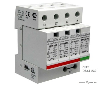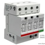 DS44 được kết hợp từ 4 module DS40. CITEL DS44 là thiết bị cắt sét 3 pha 4 dây dạng module gắn trên din-ray, bảo vệ hệ thống điện xoay chiều 3 pha 380Vac có trung tính, khả năng cắt 40kA trên mỗi dây pha hoặc trung tính. DS44 là thiết bị cắt sét type 2 và 3 theo tiêu chuẩn. Thiết bị cắt sét DS44 được phân ra các model theo mức điện áp hoạt động tối đa: DS44-230 : dùng cho mạng điện 3 pha 220/380 Vac với mức chịu quá áp liên tục tối đa 255V/pha DS44-400 : dùng cho mạng điện 3 pha 220/380 Vac với mức chịu quá áp liên tục tối đa 400V/pha Nếu chọn thêm chức năng có kết nối báo động từ xa vào DS44 thì chúng sẽ có ký hiệu tương ứng là DS44S-230 và DS44S-400 DS44 có thể được phối hợp từ 4 module DS41 hoặc 3 modul DS41 với DS40G để cho ra 2 kiểu bảo vệ gồm: Kiểu đồng hướng : DS40 kết nối giữa dây pha và trung tính với tiếp đất (xem hình 4) Kiểu khác hướng : DS40 kết nối giữa dây pha với trung tính để bảo vệ khác hướng. Thiết bị đặc biệt DS40G kết nối giữa trung tính với đất để bảo vệ đồng hướng. Kiểu bảo vệ này cho hiệu quả cao để chống sét lan truyền trên nguồn đện AC |