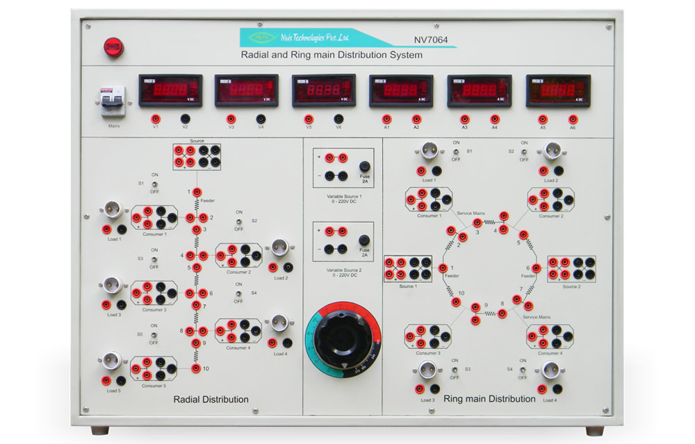 NV7064 Radial and Ring Main Distribution System is specially designed to illustrate the working phenomenon of Distribution System configured as Radial and Ring Main Distribution System. Distribution System is the part of electric power system which connects the high voltage transmission networks to the low voltage consumer service points. Distribution Systems should be designed in a way that Voltage variation at consumer terminals must be maintained with in �5%.