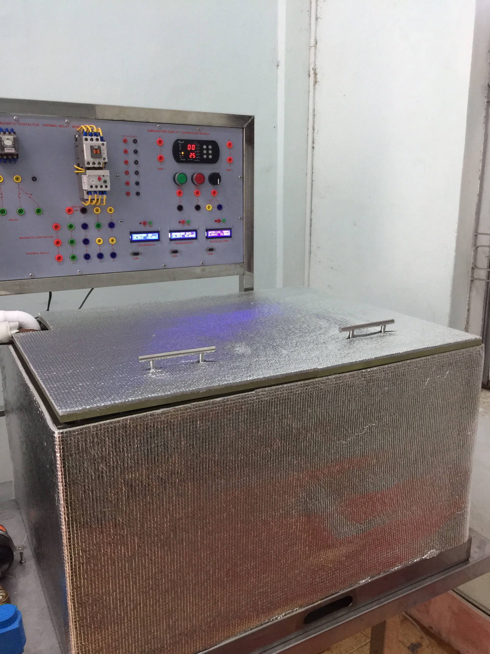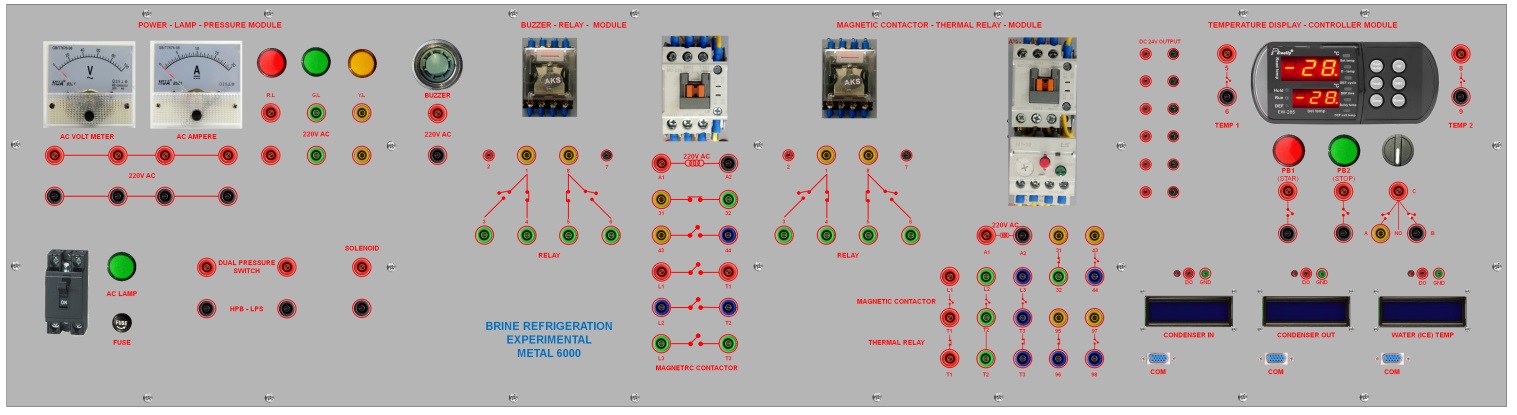 PANEL ĐIỀU KHIỂN: Nguồn điện xoay chiều 220V AC kết nối với MCB, Công tắc MCB ON OFF, Đồng hồ đo điện áp và dòng điện, Bộ còi báo động, Đèn cảnh báo (Đỏ, Xanh lục, Cam), Công tắc áp suất cao, áp suất thấp, Công tắc từ, Rơle trung gian, Rơle nhiệt, Nút nhấn, công tắt 3 vị trí, bộ hiển thị và điều khiển nhiệt độ. 03 bộ hiển thị và điều khiển nhiệt độ bằng phần mềm gồm LCD, board Arduino, board giao tiếp RS232 với máy tính. Nguồn DC 24V.