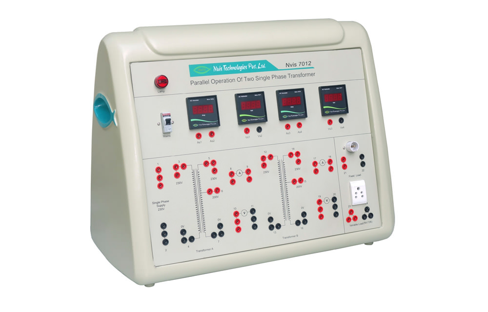 Nvis 7012 Parallel Operation of Two Single Phase Transformer has been exclusively designed to demonstrate the fundamental concepts of parallel connections of two or more single phase transformers. One can load the transformer more than the rating of the individual transformer to analyze Parallel operation phenomenon. Students can learn about the significance of connecting the two transformers in parallel and its effect on the system. Additionally, one can also learn the polarity in the transformers.