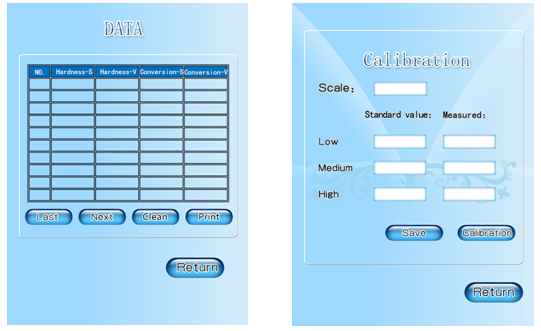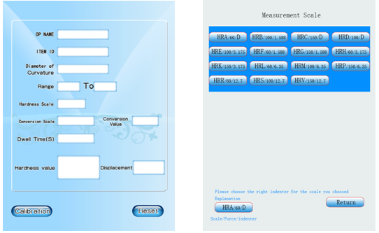 Giao diện màn hình cảm ứng, thao tác dễ dàng, chọn thang đo độ cứng trực tiếp và lực kiểm tra sẽ thay đổi trong các thông số kiểm tra tương ứng.