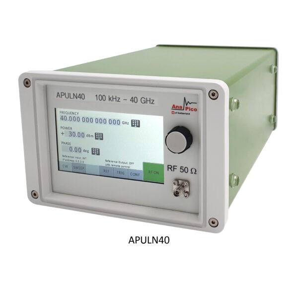 APULN là dòng máy phát tín hiệu tương tự (nguồn tín hiệu tương tự) hiệu suất cao bao gồm các dải tần số vi sóng và RF từ 100 kHz (tùy chọn 8 kHz) đến 12,75, 20, 26 và 40 GHz. Sự kết hợp của các đặc điểm như độ tinh khiết của tín hiệu tốt, độ nhiễu pha cực thấp, công suất đầu ra cao và tốc độ chuyển mạch nhanh, cùng với kích thước rất nhỏ gọn, trọng lượng thấp và tiêu thụ điện năng thấp làm cho các thiết bị này có thể sử dụng rất tốt trong phòng thí nghiệm, sản xuất và ngoài trời lĩnh vực