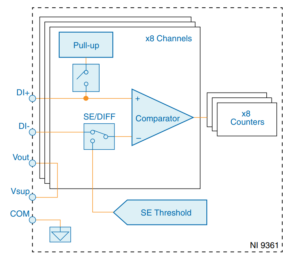NI‑9361 là mô-đun đầu vào vi sai hoặc đầu cuối đơn. Với mô-đun này, bạn có thể mở rộng ra ngoài bốn bộ đếm trong CompactDAQ để đạt tới 64 bộ đếm trên khung 8 khay mô-đun. Bạn có thể định cấu hình mỗi kênh để đọc một chuỗi xung đơn hoặc kết hợp chúng để đọc tối đa bốn encoder gia tăng. Bạn cũng có thể kết nối trực tiếp các cảm biến với đầu ra open-collector hoặc push-pull bằng cách sử dụng điện trở kéo lên 1 kΩ có thể chuyển đổi bên trong. Bộ đếm NI‑9361 có thể thực hiện các phép đo vị trí và vận tốc của encoder. Bạn có thể đồng bộ hóa các bộ đếm với các phép đo tương tự, kỹ thuật số và bộ đếm khác trong khung máy của bạn.