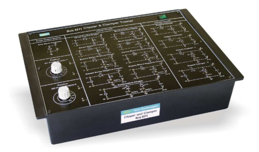 Nvis 6511 Clipper and Clamper Trainer has been designed specifically to study 13 different types of circuit for single level and two level clipping and 6 different types of circuit for clamping.