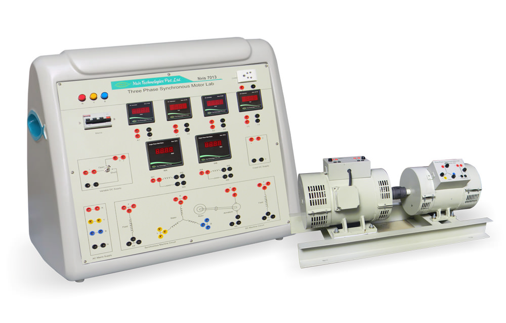 Nvis 7013 Three Phase Synchronous Motor Lab is an adaptable Training System for the Electrical Laboratories. The product helps in getting fully acquainted with the basic concepts, functioning and operating principle of a Three Phase Synchronous Motor. The product includes experiment such as V and inverse V curve of synchronous motor. For engineering students it is important to know how the variation of field cur rent can affect the power factor of the Synchronous Motor and hence improve the system’s performance.