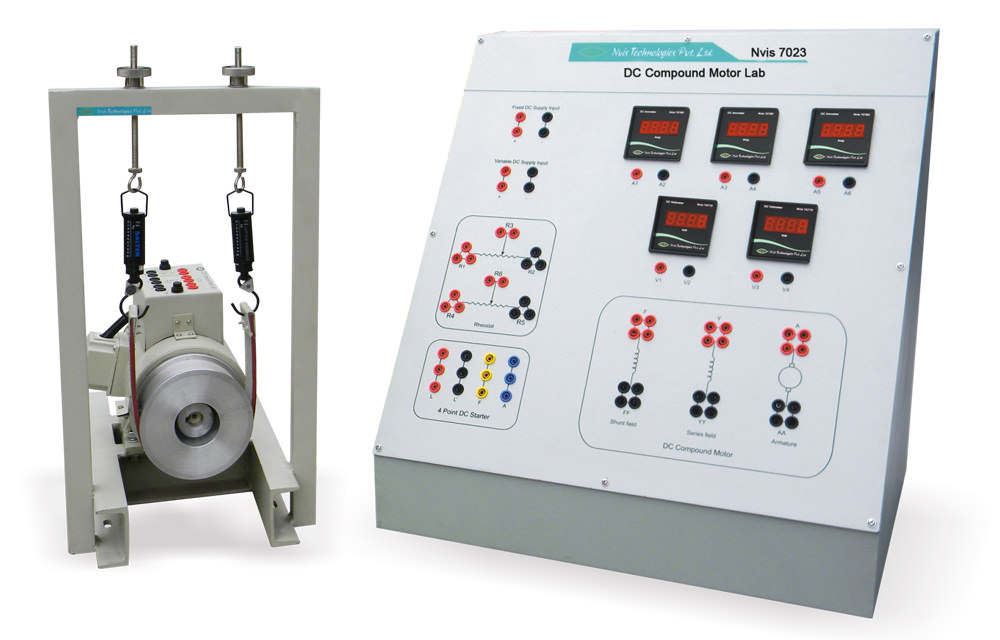 Nvis 7023 DC Compound Motor Lab is an exclusive training system designed for Electrical laboratories to demonstrate the operation of DC compound motor. Students can understand the fundamental operating principle of DC Compound Motor. This product includes various experiments such as No Load Test, Load Test and Operating Characteristics of DC Compound Motor. The training system includes terminals for 4 point starters and rheostat so that these can be connected externally to the control panel.