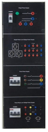 | Bộ phận cung ứng | Thông số kỹ thuật MCB (Công tắc nguồn): Một pha 10A MCB (Công tắc nguồn): Ba pha 10A Nguồn điện xoay chiều một pha: 230V, ± 10%, 50Hz 115V – 0 – 115V ± 10%, 2A Nguồn điện một chiều điện áp thấp một pha: 18V – 0 – 18V, 15V-0 Bộ nguồn DC điện áp thấp: + 30V, -30V 250mA : + 15V, -15V 250mA : + 12V, -12V 500mA : + 5V, -5V 500mA Nguồn điện xoay chiều ba pha: Điện áp pha 230V ± 10% 50Hz Điện áp 440 ± 10% 50Hz Điện áp thấp ba pha: 15V Mỗi pha ± 10%, 50Hz Nguồn cấp Kết nối: Ổ cắm an toàn 2 mm & 4mm Diode lắp ráp: Diode 6A10 1000V / 6A SCR lắp ráp: TYN 616 600V / 16AIGBT lắp ráp: IGBT G4BC20S 600V / 10A Cổng bắn cổng Dụng cụ đo lường Phạm vi công suất :: 1500V Đo lường cách ly |