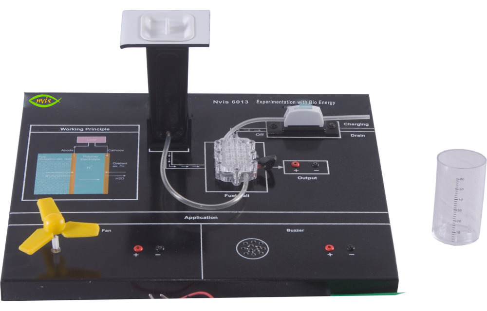 Nvis 6013 Experimentation with Bio Energy is used to demonstrate the functions of renewable fuel cell using Isopropyl alcohol as the biofuel. Bio Energy is derived from biofuels like bioethanol, biodiesel, etc. Our product uses Isopropyl alcohol as its bio fuel for energy generation. Isopropyl alcohol is an aliphatic alcohol. The energy generated can be used to run different applications like Buzzer, Fan, etc.