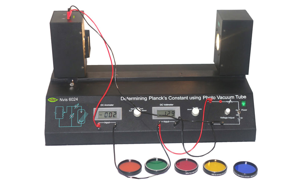 Nvis 6024 Xác định hằng số Planck `bằng ống chân không ảnh minh họa khái niệm cơ bản của Cơ học lượng tử. Nó giúp hiểu được các hiện tượng của photon, năng lượng, tần số, v.v … Sản phẩm này chủ yếu được sử dụng để xác định hằng số cơ bản của Cơ học lượng tử gọi là hằng số �Planck `. Đó là một cách hiệu quả và dễ dàng để xác định hằng số này. Đối với việc phát minh ra Planck `hằng số Max Planck được trao giải thưởng Nobel năm 1918. Thiết lập bao gồm Ống chân không hình ảnh, bộ lọc thủy tinh có màu khác nhau, Nguồn cung cấp biến thiên DC, vôn kế kỹ thuật số và ampe kế. Sử dụng thiết lập này, chúng ta cũng có thể tính toán năng lượng của photon. Hằng số Planck liên quan đến năng lượng của các photon ánh sáng với tần số của chúng.